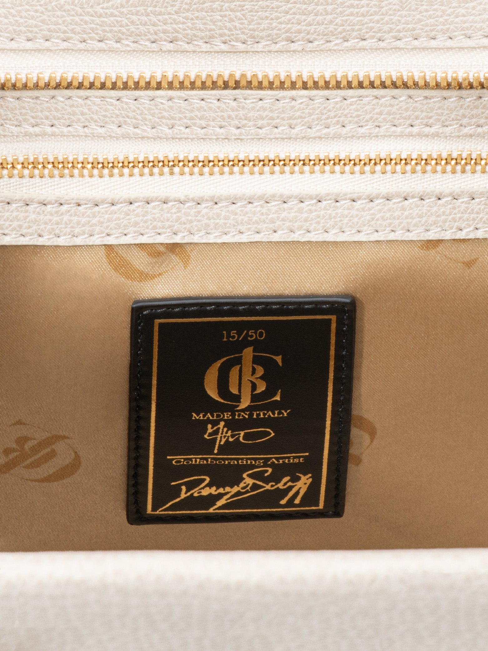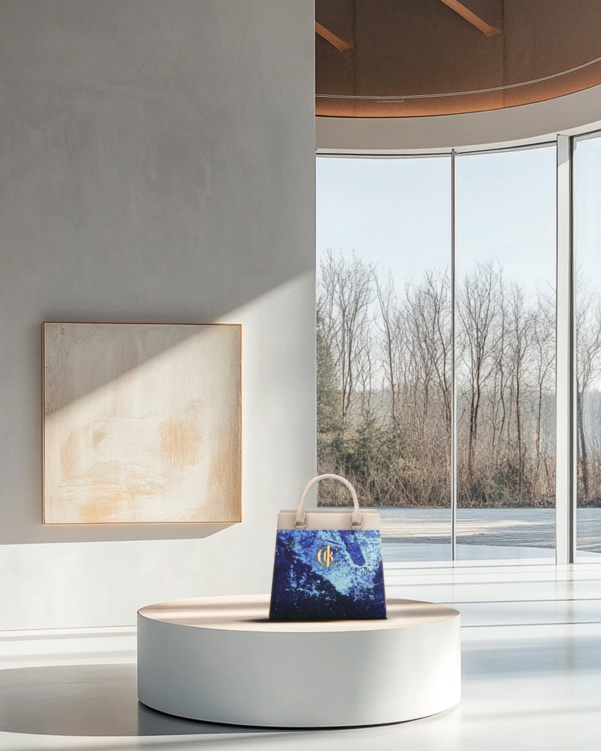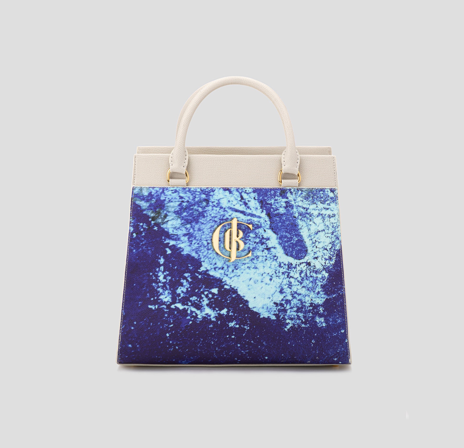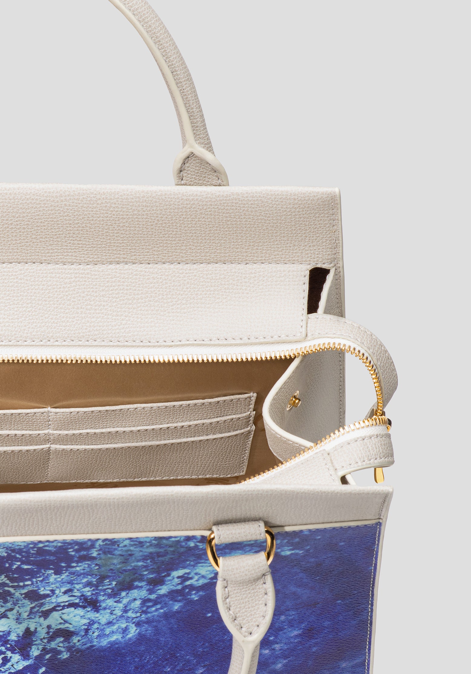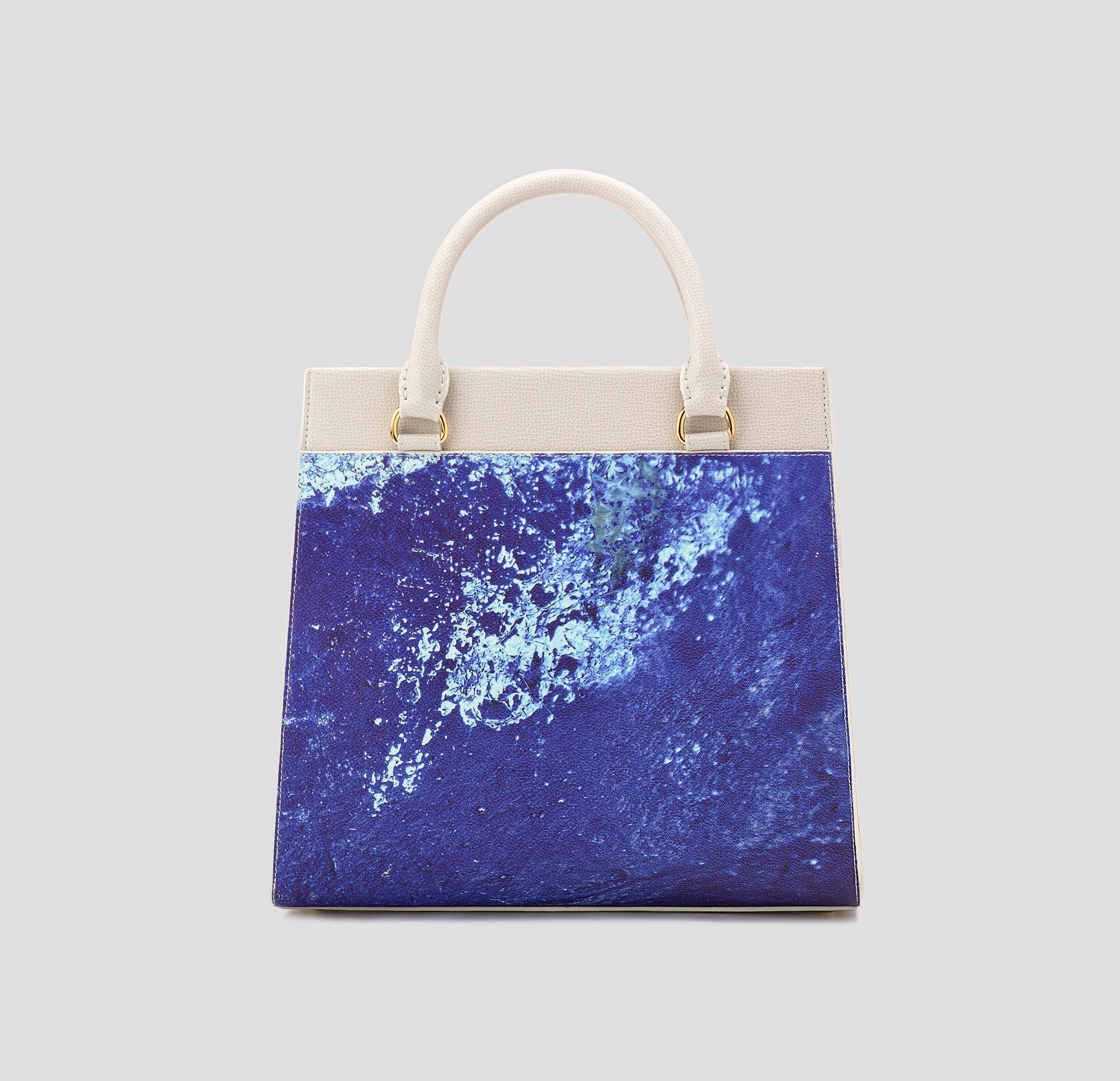 “ALIZEE” – Macrophotography taken in Apulia, Italy (Torre a Mare) of corrosion on the keel of an old boat. Materials consist of PVC-coated canvas, sustainable leather trim, and natural brass made in Italy.