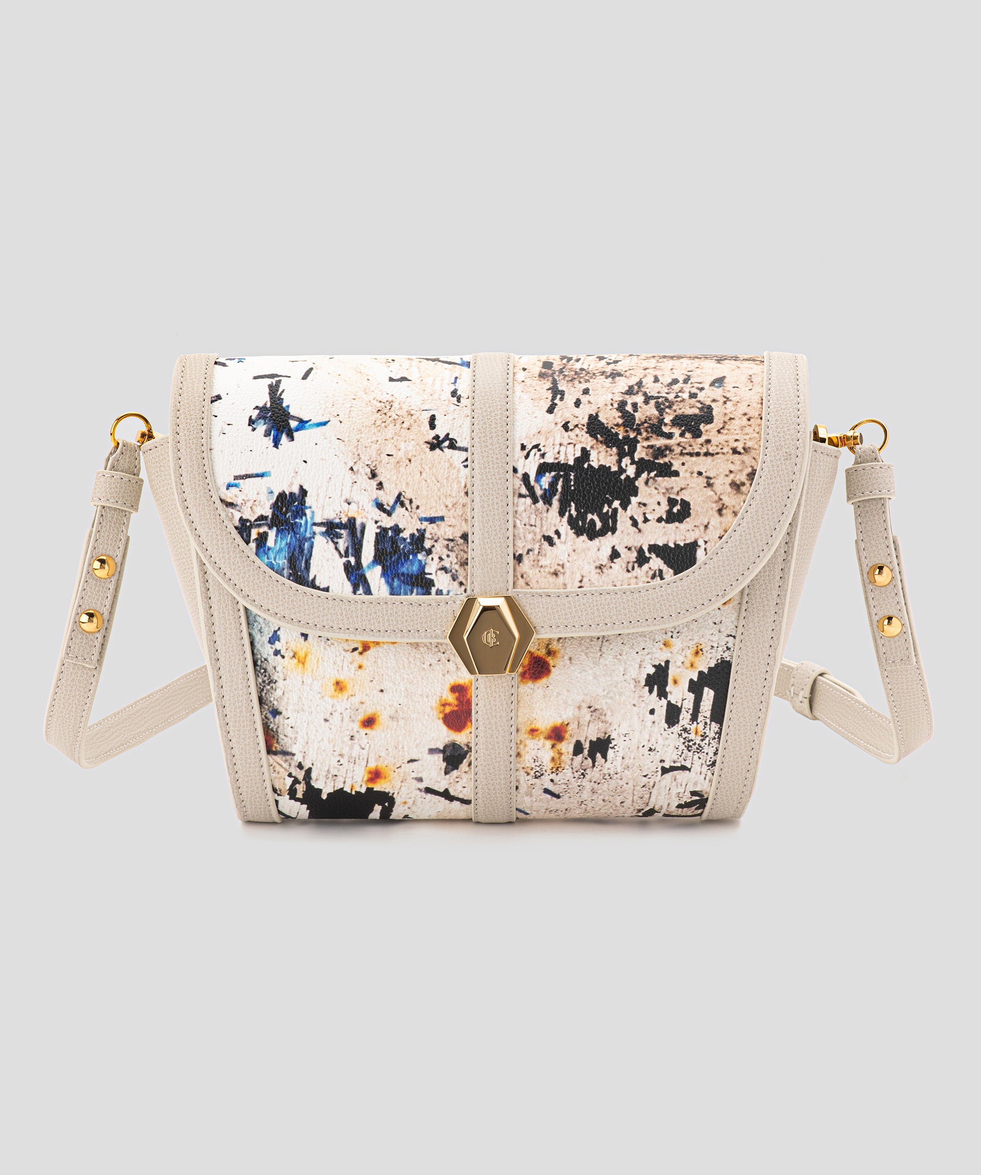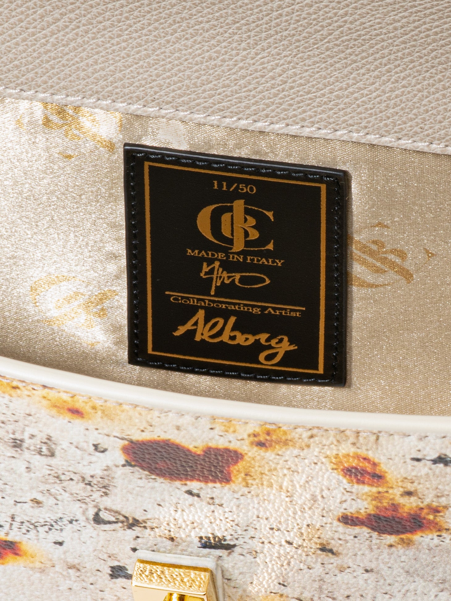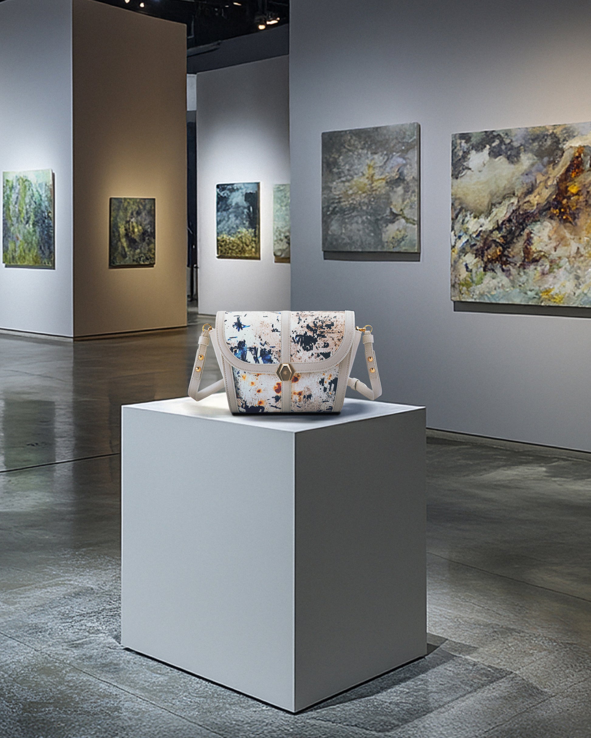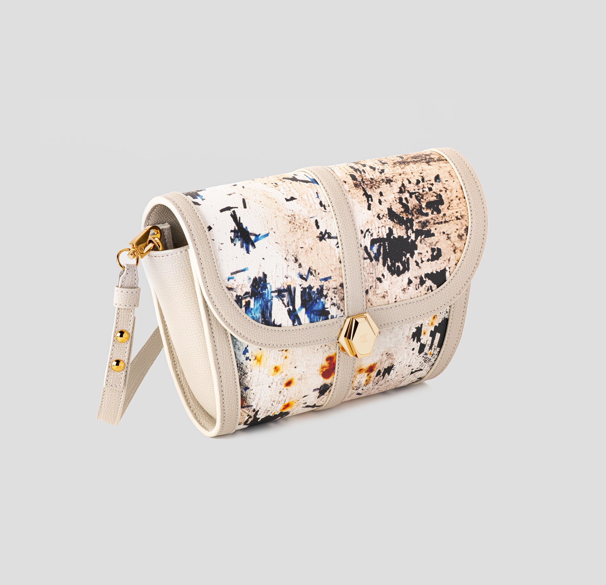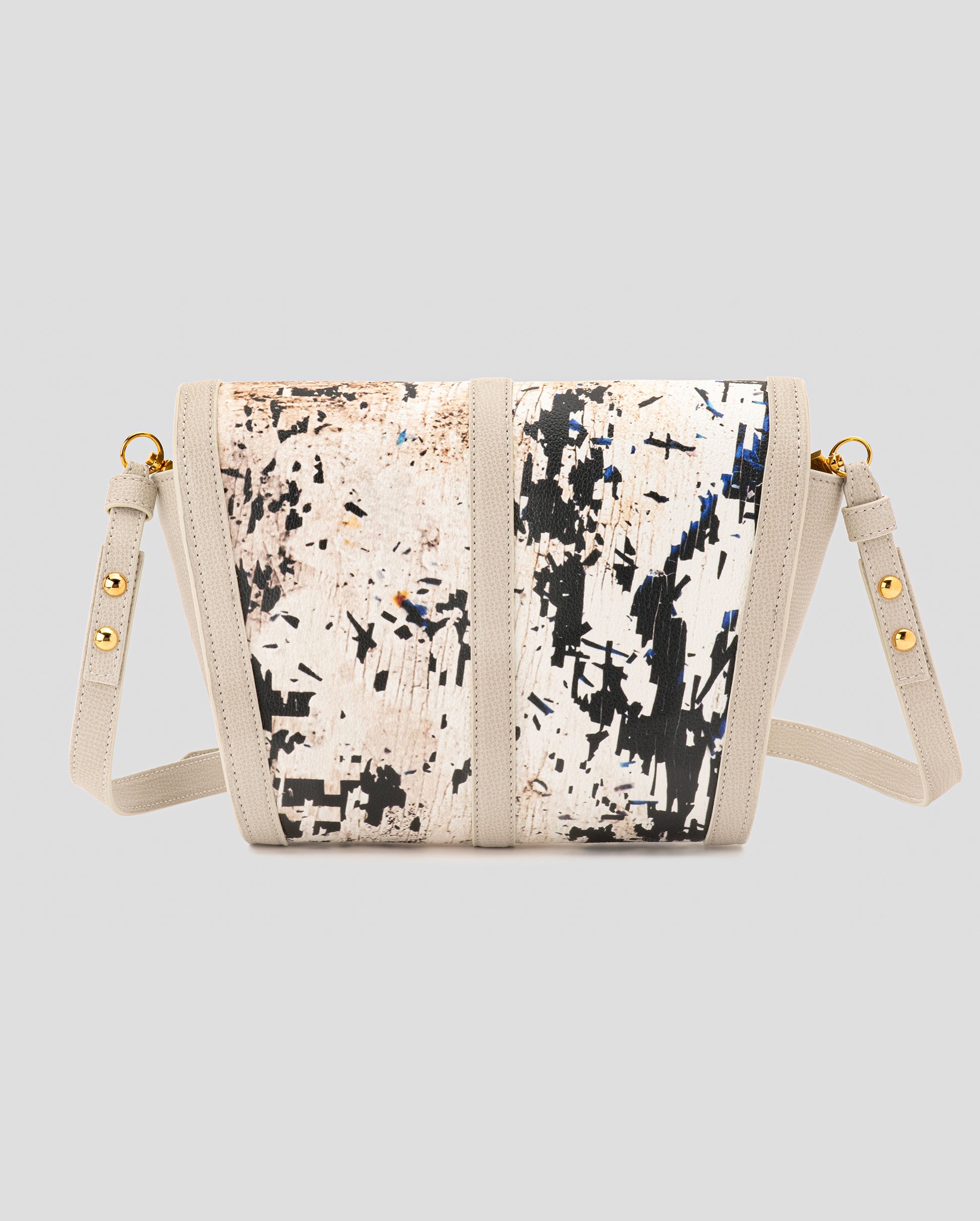 “CLOUDS (NUVOLE)” – Macrophotography taken in Bloomsbury, London of torn advertising posters, peeling walls, cracks and corrosion from a billboard. Materials consist of PVC-coated canvas, sustainable leather trim, and natural brass made in Italy.