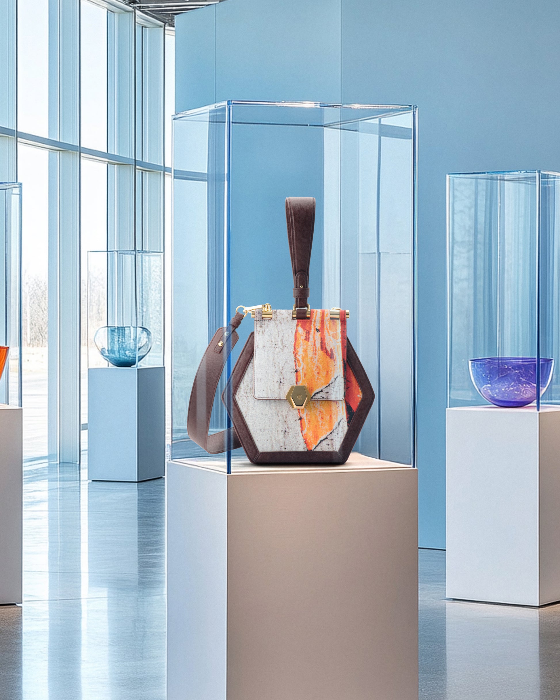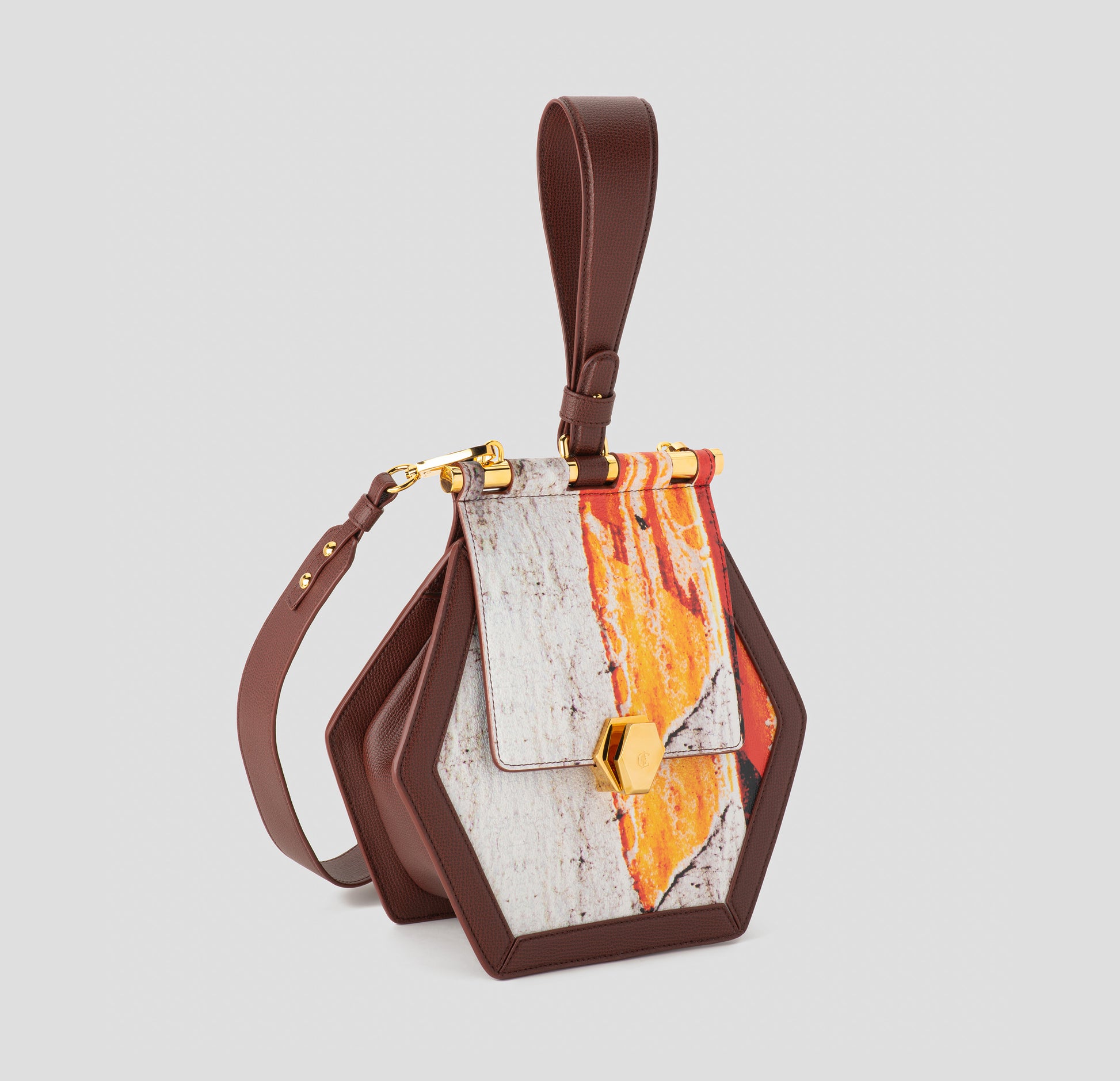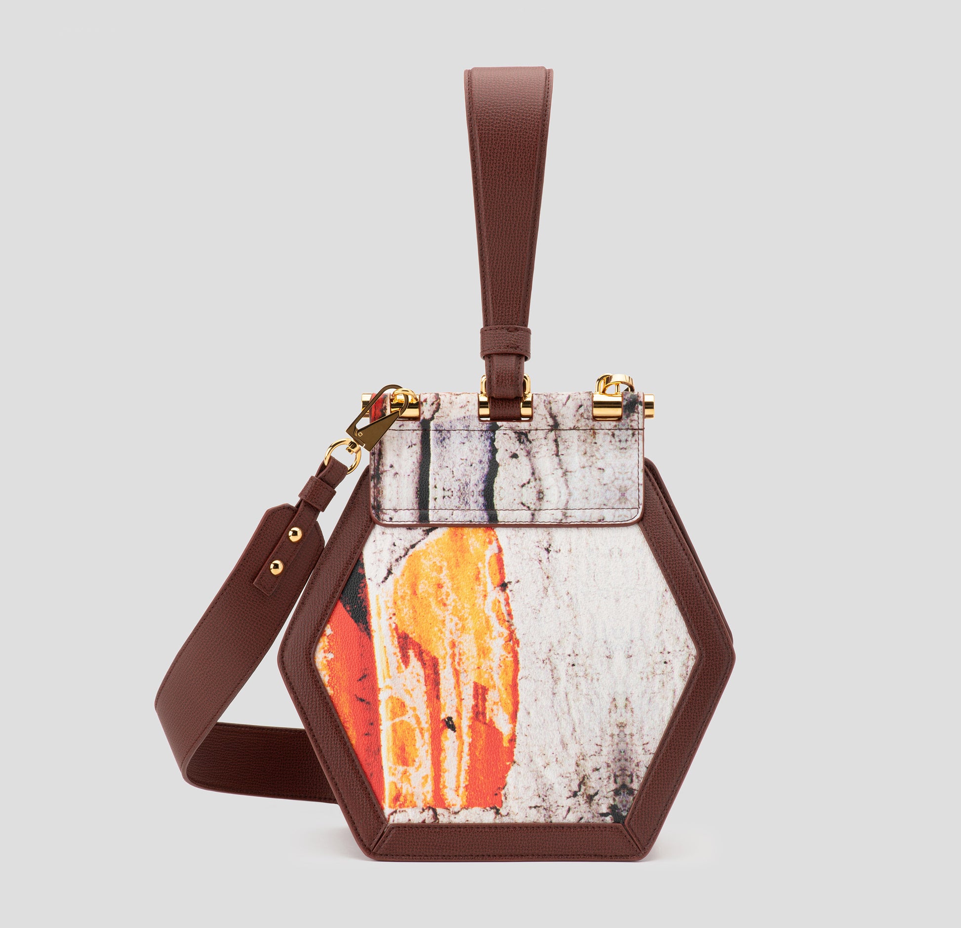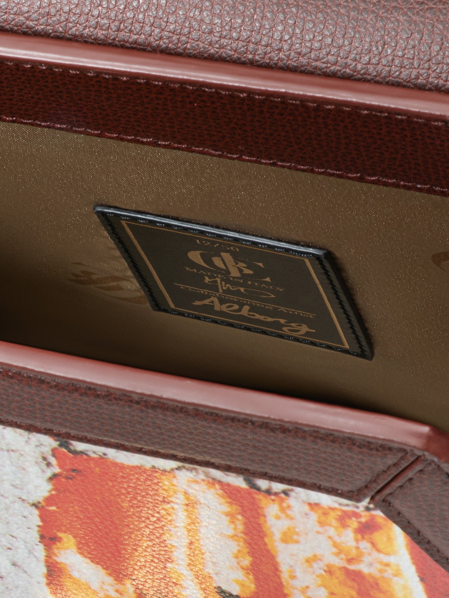 “FIAMMA (FLAME)” – Macrophotography taken in Turin, Italy of an advertising billboard placed under a bridge symbolizing the flame of dignity. Materials consist of PVC coated canvas, sustainable leather trim, and natural brass made in Italy.