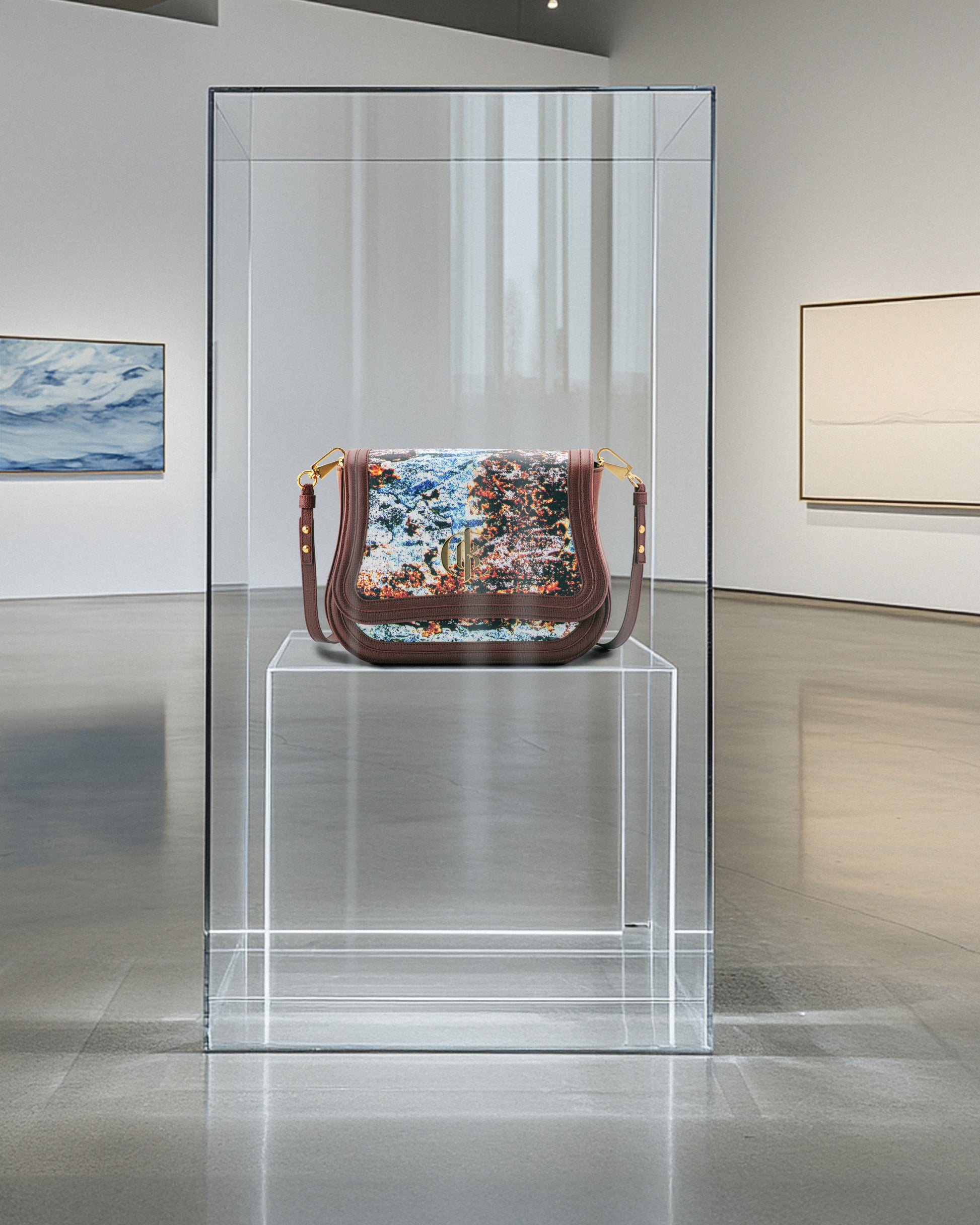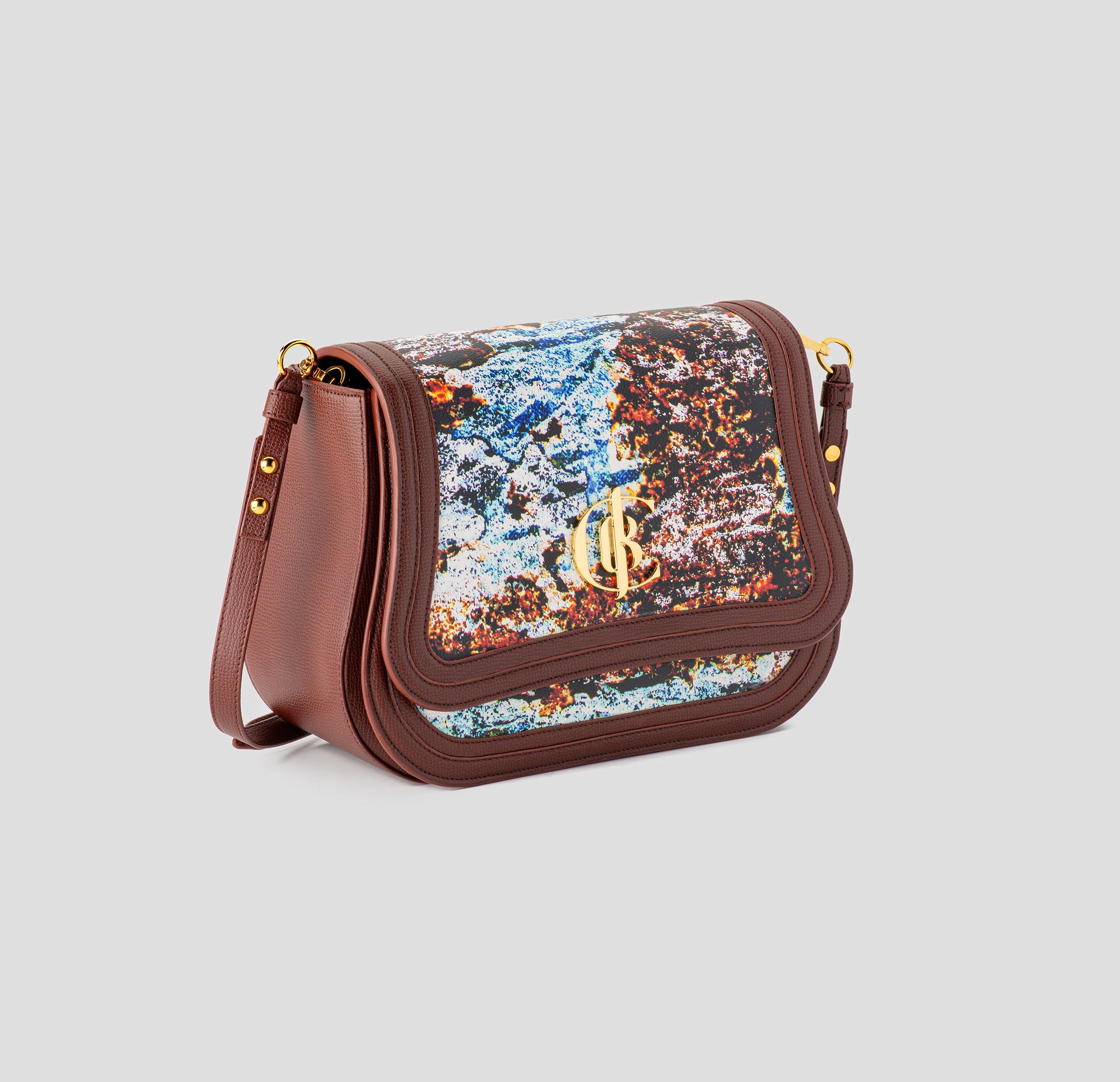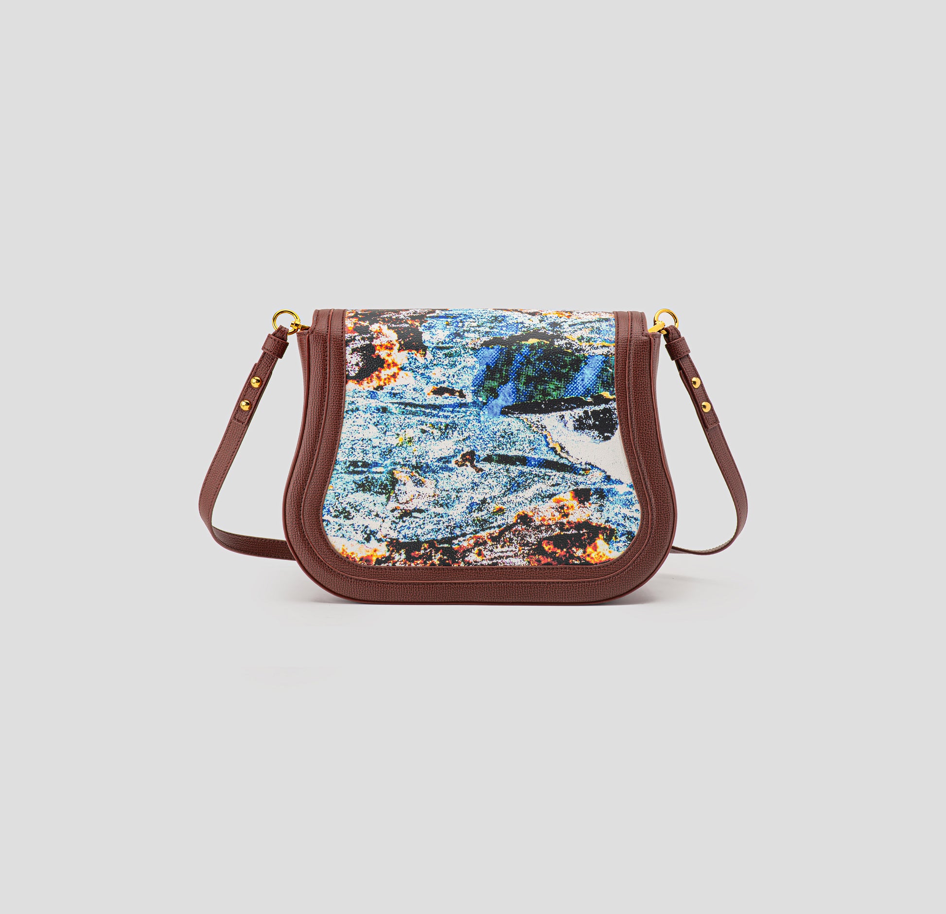 “SKYFALL” – Macrophotography taken in Italy of an advertising billboard with corroded paper and glue on a background rusted by water and time. The image symbolizes glimpses of the sky. Materials consist of PVC coated canvas, sustainable leather trim, and natural brass made in Italy.