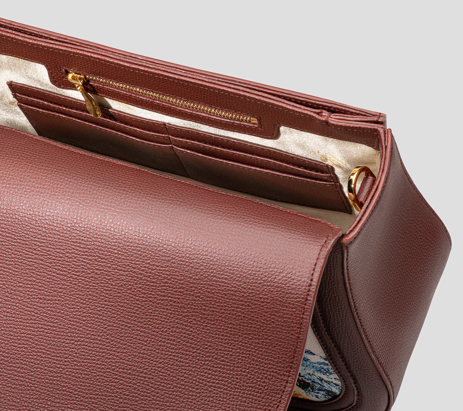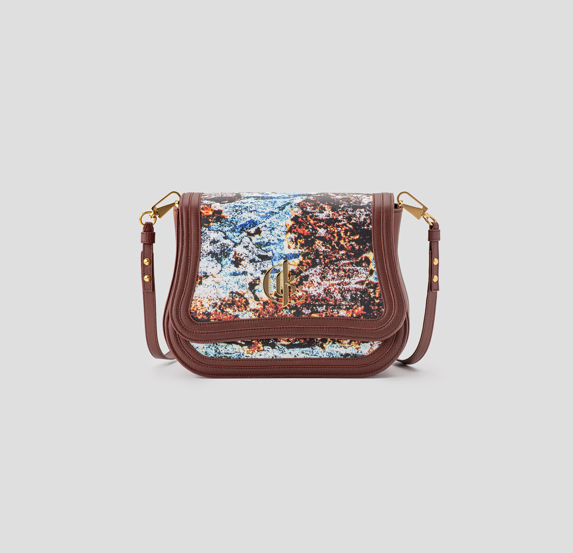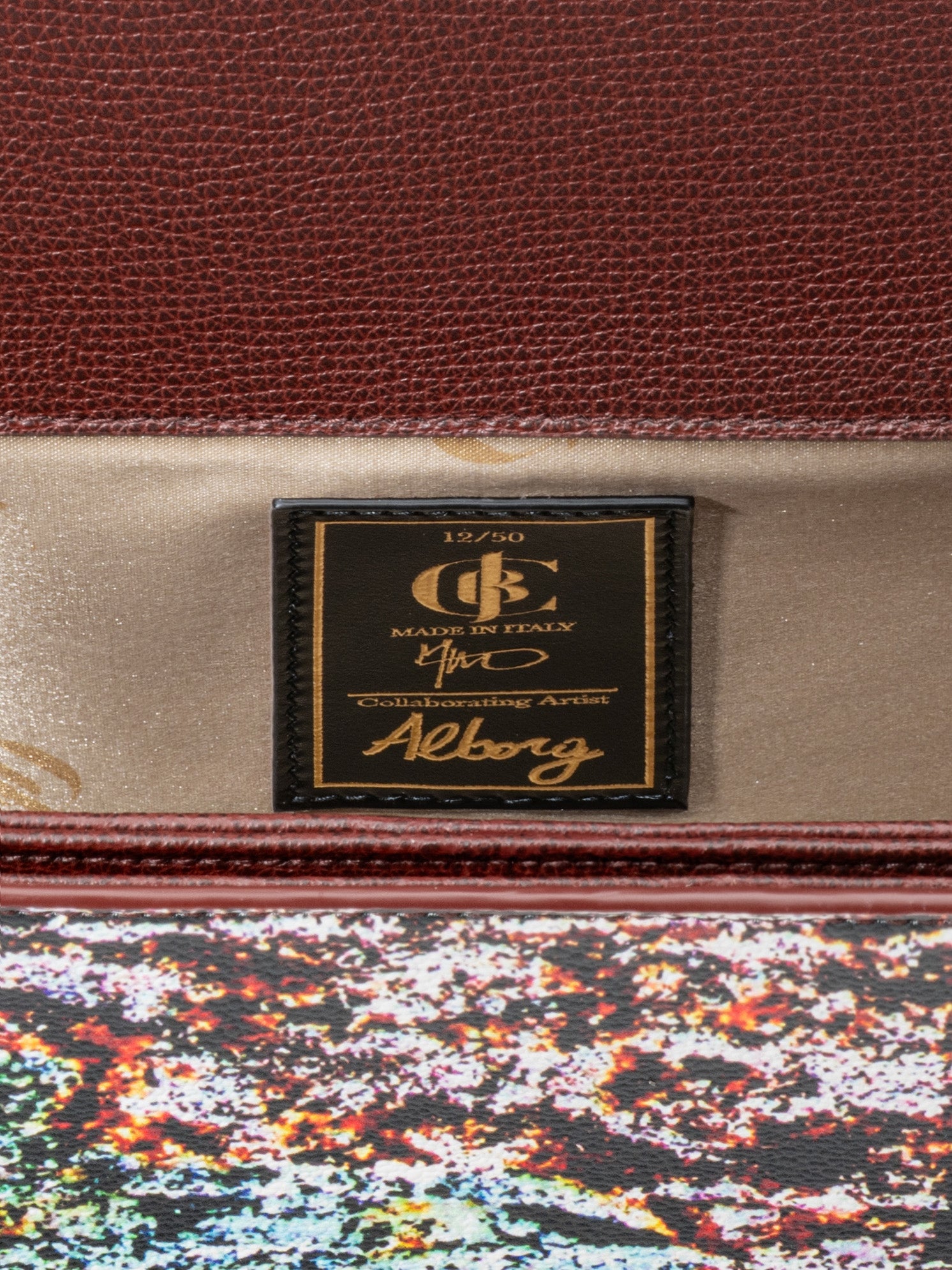 “SKYFALL” – Macrophotography taken in Italy of an advertising billboard with corroded paper and glue on a background rusted by water and time. The image symbolizes glimpses of the sky. Materials consist of PVC coated canvas, sustainable leather trim, and natural brass made in Italy.